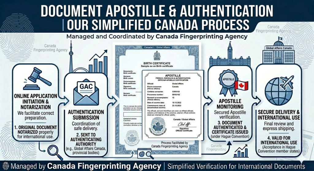 We offer a complete Apostille forwarding service. You bring us your document, and we handle the entire submission process โ including forwarding to the appropriate Canadian authority (Global Affairs Canada) for apostille certification, then returning the certified document to you.